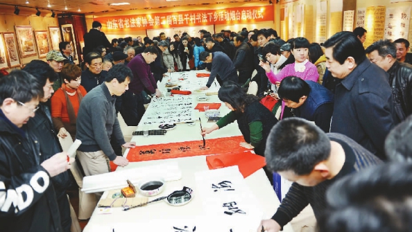 顧亞龍說,作為一名書法工作者,能夠通過我們實際的工作,為基層的老百姓多做些實事,我們山東省書協(xié)感到很欣慰和高興?!鞍倏h千村”活動開展以來,在山東省書協(xié)組織安排下,全省近2000名書法家走進百縣千村,開展文化惠民活動。