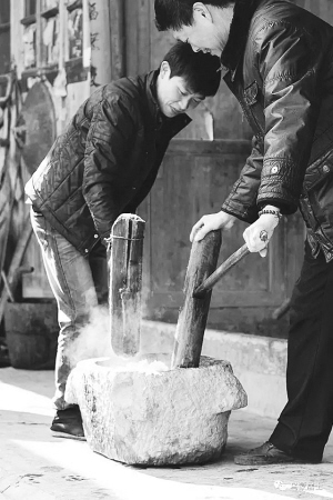 打糍粑的人圍在槽的周圍,來回變換方向,打一會(huì)兒,揉一會(huì)兒,一會(huì)兒向前,一會(huì)兒退后,一會(huì)兒順時(shí)針,一會(huì)兒逆時(shí)針,交錯(cuò)進(jìn)行,這樣才能把糯米砸碎揉勻。等到糯米飯粒都黏糊糊的了,女人們就把手放在清水里過一下,把糯米飯粒捏成鐵餅形狀,放入鋪了一層大米粉的篾盆里。嘴饞的孩子們迫不及待地?fù)溥^去,抓起剛做好的糍粑,蘸著酥麻,開吃。