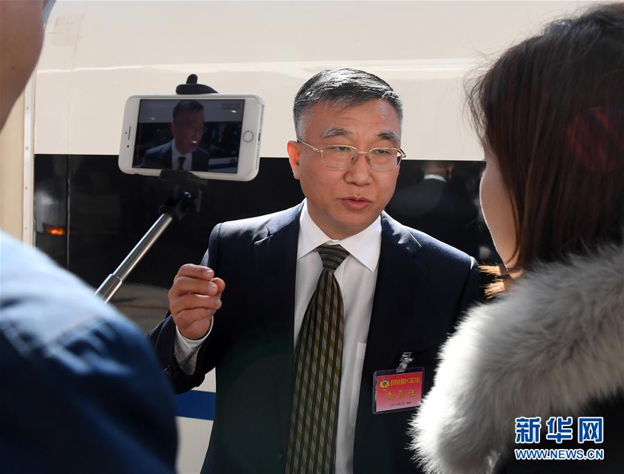 3月2日,出席十二屆全國(guó)人大五次會(huì)議的黑龍江代表團(tuán)乘坐火車抵達(dá)北京站。這是全國(guó)人大代表王景海在接受記者采訪。 新華社記者 金立旺 攝