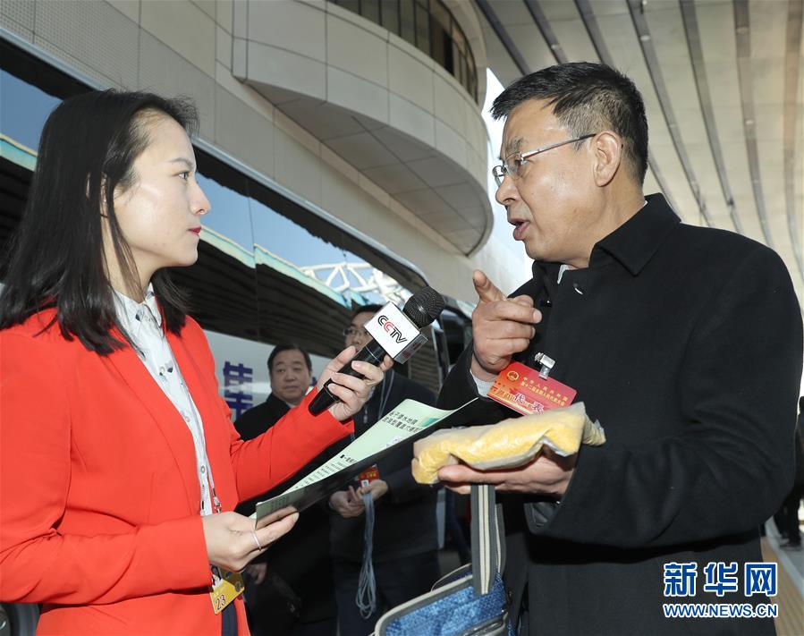 3月2日,出席十二屆全國(guó)人大五次會(huì)議的山西代表團(tuán)乘坐火車抵達(dá)北京西站。這是全國(guó)人大代表姚建民(右)在接受記者采訪。 新華社記者 陳建力攝
