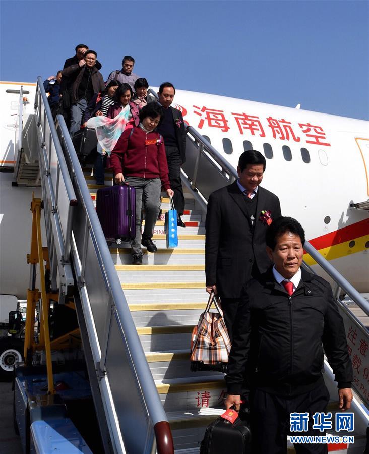 3月2日,出席十二屆全國(guó)人大五次會(huì)議的海南代表團(tuán)乘坐飛機(jī)抵達(dá)北京。新華社記者趙穎全攝