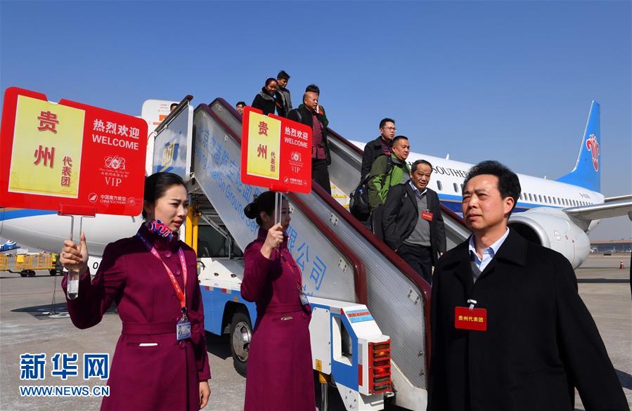 3月2日,出席十二屆全國(guó)人大五次會(huì)議的貴州代表團(tuán)乘坐飛機(jī)抵達(dá)北京。新華社記者趙穎全攝