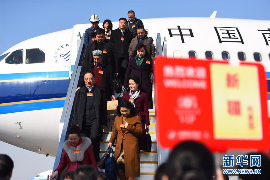 3月2日,出席十二屆全國(guó)人大五次會(huì)議的新疆代表團(tuán)乘坐飛機(jī)抵達(dá)北京。新華社記者陳曄華攝