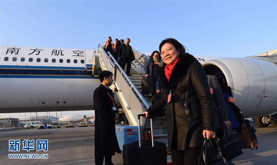 3月2日,出席十二屆全國(guó)人大五次會(huì)議的廣東代表團(tuán)乘坐飛機(jī)抵達(dá)北京。新華社記者陳曄華攝