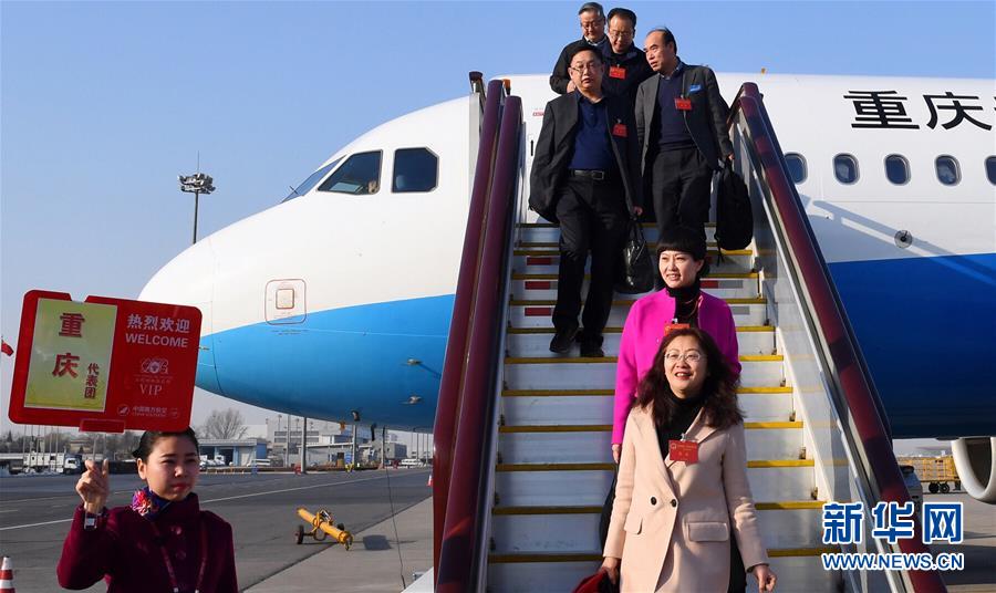 3月2日,出席十二屆全國(guó)人大五次會(huì)議的重慶代表團(tuán)乘坐飛機(jī)抵達(dá)北京。新華社記者趙穎全攝