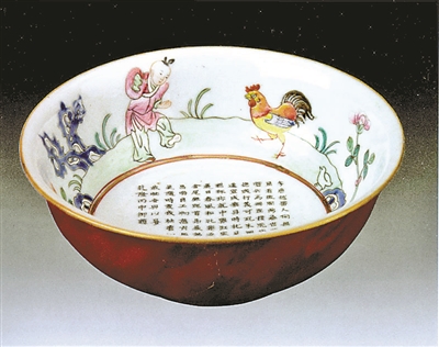 此外,一件清代初期的青花瓷罐,罐身上畫有牡丹,花叢中有兩只雉雞相互顧盼。畫法工整、傳神。牡丹以雍容富麗的花姿號稱百花之王,寓意富貴;雞與“吉”諧音,有吉祥之意。另一件延慶出土的清代粉彩斗雞碗,雄雞邁步向前,黑色尾羽翹張開來,后跟一雛雞,前面一童子作邀斗狀。紅色雞冠、黃色雞喙、黑色雞尾、藍(lán)色雞翅,都點綴得恰到好處。雖為斗雞,但毫無緊張之氣,而是其樂融融。