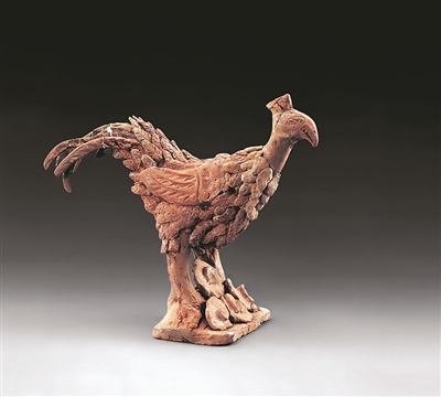 小說中的“鷹爪”變成了隨葬的陶鳳。陶鳳尖喙前伸,頭有鳳冠,羽翼雕刻細(xì)膩,齊整繁密,直立方板上,是元代典型的風(fēng)格。雖然有雞不如鳳之說,但實際上如同大多數(shù)鳳一樣,它的原形來自于現(xiàn)實中的雞。