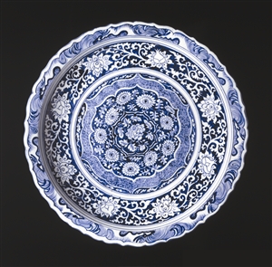 元青花瓷盤陳列在“變革與適應(yīng)”中。公元900至1550年是一個在藝術(shù)和技術(shù)上取得巨大成就的時期,其物品常顯出驚人的創(chuàng)造性,許多物品至今仍被視為文化象征。奧斯曼土耳其的伊茲尼克瓷器、中國的元青花及尼日利亞的雕刻都是詮釋制作它們的那些社會的標志性產(chǎn)品。