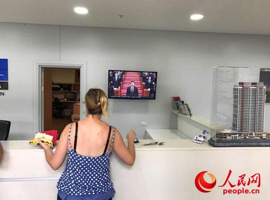 澳大利亞昆士蘭州一棟公寓進(jìn)門大堂處,墻上的電視正在直播全國政協(xié)十二屆五次會(huì)議開幕式。