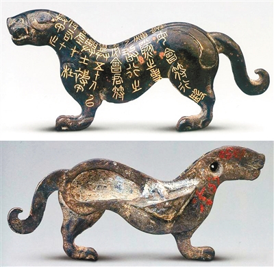 這枚 “戰(zhàn)國·秦·杜虎符”鑄于秦惠文君稱王前,秦國只有惠文君一人稱君,所以,杜虎符應(yīng)是惠文君在位時(shí)制作的。而銘文中提到的“杜”地,為戰(zhàn)國時(shí)秦國杜縣,故址在今西安市南?!皯?zhàn)國·秦·杜虎符”上的銘文是所有出土虎符中銘文最長的,且保存完好。特別是40個(gè)錯(cuò)金字,是在虎身鏤刻陰文,再將金絲嵌入陰文之內(nèi),最后鏤平打磨光亮,雖歷經(jīng)兩千多年,仍熠熠閃光。字體絕大部分是小篆,規(guī)整挺秀,反映了中國古代錯(cuò)金工藝的高超水平。