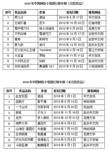 2016年中國網(wǎng)絡(luò)小說排行榜年榜。 中國作家網(wǎng) 圖