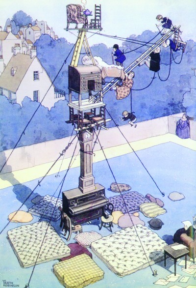 用上述異想天開的畫風,希斯給很多工廠“改進”過工藝。它們確實夠新奇大膽,卻只有傻瓜廠長才會采納?!杜=蛴⒄Z詞典》干脆管畫中這些繁瑣而無用的裝置叫“希斯·羅賓遜的裝置”,意為“奇妙、荒謬、過于復雜”。英國人,真會玩兒!