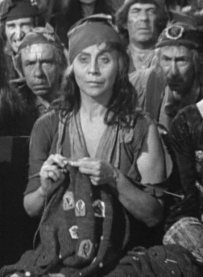 就英國文學而言,讀過19世紀英國小說家狄更斯《雙城記》的讀者,一定記得小說中有一位得伐石夫人(MadameDefarge),她總是坐在小酒店的柜臺后面編織。她“有一雙似乎什么都不看卻什么都不放過的眼睛。一只大手上戴著沉甸甸的戒指,臉色鎮(zhèn)靜,相貌堅毅,舉止從容不迫。得伐石太太身上有一種品質(zhì),讓人可以由此斷定,她所經(jīng)營的任何賬目都是不會出錯的。生性怕冷的得伐石太太身上緊裹著毛皮衣服,頭頸上還圍著一塊色彩鮮明的披肩,不過一對大耳環(huán)倒沒有遮住。她面前擺著編織活……”。這里所說的“任何賬目”應該包括埋藏在她心中的那本血淚賬。她在那里不慌不忙、聚精會神地編織,她是在編織對埃吾瑞蒙德家族乃至整個貴族階級的仇恨。“她用她自己的針法和符號,用編織的方法把事情記錄下來,一切就明白得像青天白日一樣。相信她吧。那些膽小的懦夫可以抹去自己的存在,卻沒法從得伐石太太編織物上抹去自己的名字和罪行。”得伐石太太不停地編織裹尸布。她一邊編織,一邊數(shù)著那一顆顆落下來的人頭。