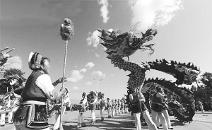 舞龍的隊(duì)伍過(guò)來(lái)了。一條大黃龍扭動(dòng)著碩長(zhǎng)的身軀,張牙舞爪地欲吞下近在咫尺的寶珠,而龍嘴與寶珠始終就差那么一點(diǎn)點(diǎn)距離。龍焦躁不安,舞動(dòng)起伏的弧度更大了……
