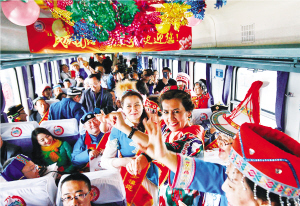 新疆56個民族代表同乘“民族團結一家親號”列車,車廂似歡樂的海洋。吳卓勝 攝