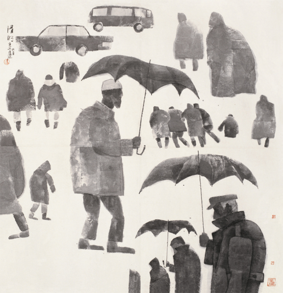 盧沉的探索不僅停留在造型與筆墨層面,上世紀80年代在現(xiàn)代化的大背景下,他追求抽象的思維能力,將西方的構(gòu)成意識、形式分析的方法應用于水墨畫創(chuàng)作之中,《清明》是這一時期的代表作?!肚迕鳌繁憩F(xiàn)的是清明雨季路上撐傘的行人,用幾何形的平面造型表現(xiàn)人物的側(cè)影、背影,通過形式分析的方法把畫面進行了有意味的分割,也輔助指引了觀者的欣賞順序。畫面整體的淡墨著色,傳達出一種寧靜的氛圍與悲傷的情緒。這幅畫于1990年創(chuàng)作完成之后在中國美術館和深圳美術館展出,引起了畫壇對盧沉創(chuàng)新精神的進一步關注。