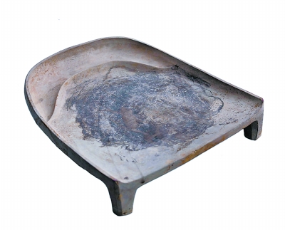 此硯規(guī)格碩大,長達32厘米,寬27.5厘米,高5.7厘米。外形呈“風(fēng)”字狀,雙足,故稱雙足風(fēng)字硯。此種風(fēng)字硯又因形制類似農(nóng)具簸箕,也稱箕形硯。泥色灰黃,色澤華美,質(zhì)地堅密細(xì)膩。硯體土銹浸蝕,硯堂墨銹斑駁,植物根須沁于硯表,跡近鈣化。硯堂與墨池之間有月牙形攔水墻相隔。此硯為盛唐時制品。出土、傳世各有一款同類硯品可以互證。