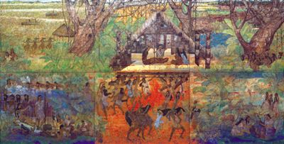 作為歷史題材美術(shù)創(chuàng)作,《河姆渡文化》不僅要反映幾千年長(zhǎng)江中下游流域氏族的情況,還要突破固有思維對(duì)“真實(shí)歷史”的認(rèn)知局限,以非還原的手法使構(gòu)思的真實(shí)性與內(nèi)容的浪漫性在現(xiàn)代與古代信息點(diǎn)上穿梭往返,使想象與現(xiàn)實(shí)、歷史與考古有機(jī)結(jié)合,變成藝術(shù)家創(chuàng)造性想象的新歷史繪畫。因此,《河姆渡文化》在尊重歷史的基礎(chǔ)上以縱向和橫向兩條考察線索進(jìn)入——縱向上透過河姆渡文化遺址的歷史疊壓層的文化印記看歷史,橫向上感受考古清理出的各類生活用品看現(xiàn)象,在那里,人類文明的技藝與生活經(jīng)驗(yàn)不斷傳遞,烙下中華民族心理的印痕?!逗幽范晌幕愤@種還原歷史的方式,不是歷史的再現(xiàn),更不是圖解,而是現(xiàn)代人對(duì)于歷史的重新演繹和創(chuàng)造,是藝術(shù)的歷史現(xiàn)實(shí)。