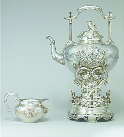 盧浮宮藏中國風(fēng)茶壺與奶壺是19世紀(jì)中期法國經(jīng)典的“中國風(fēng)”設(shè)計。與早期洛可可風(fēng)格的虛幻想象、輕浮繁縟相比,此時期表現(xiàn)出的中國元素有根有據(jù),壺身形態(tài)與開光紋飾、壺蓋的獸形鈕,以及壺流及提梁的樹干造型都模仿得頗為精心。壺的龍紋支架及底座造型也很傳神。這些中國風(fēng)銀茶具如此精美大氣,可見飲茶在當(dāng)時巴黎上層社會,仍被作為高尚奢華的生活內(nèi)容來表現(xiàn)。