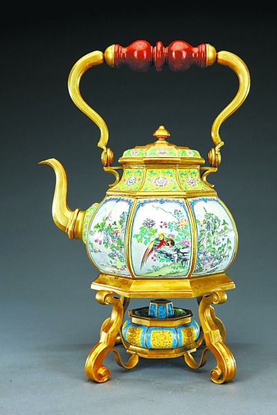 銅鍍金畫琺瑯八棱開光提梁壺 清乾?。?8世紀(jì)) 故宮博物院藏品