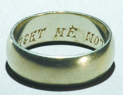 民國十一年,仍居住在故宮后寢區(qū)域的遜帝溥儀娶了內(nèi)務(wù)府大臣郭布羅·榮源的女兒婉容。婉容和溥儀都接受過詩書和英文教育。這對年輕的貴族小夫妻性情投合,在生活方式上一起追逐時尚。他們的一對鎳金戒指外圈光素,只在戒指內(nèi)壁鏨刻字樣,一枚為英文“I LOVE YOU FORGET ME NOT”(我愛你,勿忘我),另一枚為漢字“允執(zhí)厥中,惟精惟一”,此八字出自《尚書》,為清代帝王珍重的政治修養(yǎng)箴言,意喻帝王應(yīng)信守中正,精純專一。現(xiàn)在看來,這兩枚戒指沒有什么特別之處,但在當(dāng)時也代表著一種新材質(zhì)新風(fēng)格的流行。