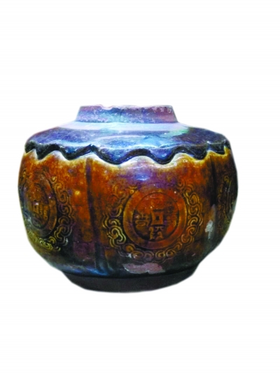 一個(gè)巨型“大蘋果”十分奪目,它是明晚期的一只紫砂冬瓜釉茶葉罐,名為“蘋果尊”。在當(dāng)時(shí)制作這種中間寬兩頭窄的器型是十分困難的,尤其從底部向上延伸的弧度要自然舒張。所掛之釉是采用原礦料調(diào)配而成,后世很難仿制。