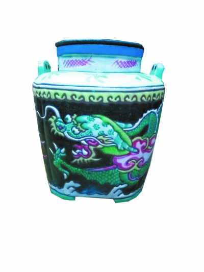 清朝時(shí)的紫砂掛釉器物更傾向于華麗。朱銀木收藏的清中期四方倭角龍紋壺,艷麗多彩,盡顯雍容華貴。壺身上的青龍栩栩如生,呼之欲出,而四爪的腳則說明這件器物在當(dāng)時(shí)只有王公顯貴才可使用。這類紫砂彩釉壺不惜工時(shí)、精工細(xì)作。為了使紫砂器繪上釉彩,需進(jìn)行二次燒制,甚至三次,即使到了現(xiàn)在也需要10天左右才能完成燒制?!斑@把壺雖然殘缺了,但我還是很喜歡,它是紫砂掛釉器物中難得的精品。”朱銀木將這把龍紋提梁壺視若珍寶。