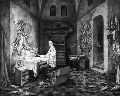 巴羅是有著極高素養(yǎng)的女藝術(shù)家,除了繪畫,她還熱衷哲學與科學。她好鉆研、好讀書,甚至將自己的繪畫體驗用紙筆記錄下來,她表示自己看重的是每一次的繪畫過程而非結(jié)果。在她的作品中,人們不僅看到一個天馬行空、充滿想象的奇妙世界,還能看到巴羅對科學的理性理解與藝術(shù)闡釋。她的畫作對科學的領(lǐng)悟甚至具有前瞻性,獲得后世不少科學家的認可與稱贊。其中,《不順從的植物》描繪了一個科學家試驗種植各種奇花異草,卻在它們的瘋狂生長下無能為力,巴羅借此表達一種對科學局限性的批判,認為科學有時無法解釋所有自然現(xiàn)象,因此不可濫用科學,應(yīng)當順從自然的和諧發(fā)展?!妒е噩F(xiàn)象》描繪了科學家在放滿地球儀的實驗室,模擬宇宙星球的公轉(zhuǎn)自轉(zhuǎn),由此體驗到一種由失重狀態(tài)帶來的空間維度改變的現(xiàn)象。這幅畫被北美天文學家稱奇,夸贊巴羅用繪畫描繪出了這種宇宙中的失重體驗,后來這幅作品還被德國裔美籍物理學家彼得·貝格曼的《重力之謎》一書選作封面?!读骼说男求w》是巴羅對宇宙運行的擬人化描繪,她將萬物生長的中心——太陽刻畫成手持風車行走的主人,他的行走牽動了月亮及其他星球的運動,而他自己則累得滿頭大汗,這種刻畫體現(xiàn)了巴羅對于太陽引力約束天體的太陽系運行的深刻理解?!缎求w運行》描繪了一個形似海馬的精靈頭頂衛(wèi)星狀的發(fā)射器穿梭于宇宙空間之中,它的運行似乎要靠腳下自行車的前進,又似乎要靠頭上葉片式發(fā)射器的定位,然而這種奇特的藝術(shù)構(gòu)想?yún)s是巴羅對科學熱愛的完美體現(xiàn)?!锻蛔凅w——地質(zhì)學家的發(fā)現(xiàn)》刻畫了地質(zhì)學家在觀察到被原子彈破壞后的地表結(jié)構(gòu)所表現(xiàn)的驚訝與悲哀。地表干涸、土地開裂、寸草不生,一株向陽花孤零零地站立在沙土之上,喻示人類在濫用科學之后孤寂潦倒的悲慘結(jié)局。巴羅的遺作《靜物復(fù)活》再次描繪了看似被施魔法的靜物從桌面飛旋而起,如同宇宙星球在太陽引力的作用下圍繞發(fā)光體蠟燭公轉(zhuǎn)自轉(zhuǎn)一樣,這幅畫中未出現(xiàn)任何人物,卻暗示了一種生命自然運轉(zhuǎn)的科學道理,似乎是巴羅在告別人世之前對自己生命終結(jié)的一種預(yù)示,以及對肉體死亡、精神復(fù)活并永存人間的一種愿景。整幅畫色調(diào)明暗相間,飛轉(zhuǎn)起來的水果顆粒飽滿、鮮紅透亮,在燭光的掩映下閃閃發(fā)光,蕩起一圈圈軌道般的光波。圓桌四周暗角的地面上長出綠色的嫩芽,那是新生命的誕生。屋頂上盤旋著蜻蜓般敏捷飛舞的鳥兒,如同喚醒生命的精靈,或許也是巴羅對自己羽化升天的唯美暗示。