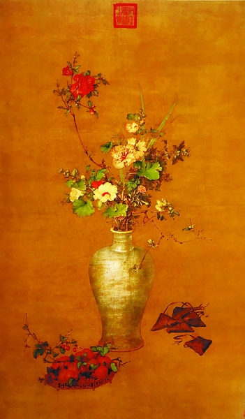 為中華文化所折服的西洋畫家郎世寧,也來(lái)湊端午的熱鬧。溫潤(rùn)厚重的青瓷花瓶、瑰麗華美的夏日之花,襯著青青的艾葉,透出繁榮的五月景象。幾枚古銅色的包粽、一盒花果,畫面烘托的是“富貴吉祥”的安康知足。