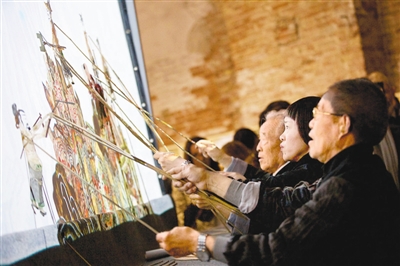 第57屆威尼斯國際藝術(shù)雙年展中國館,藝術(shù)家在表演皮影戲。 新華社記者 金 宇攝