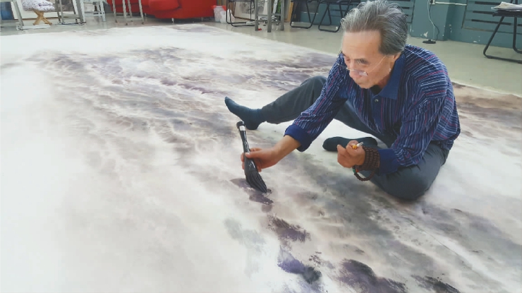 2016年9月,由宋雨桂領(lǐng)銜主創(chuàng)的《中華文明歷史題材美術(shù)創(chuàng)作工程》入選作品《黃河雄姿》的創(chuàng)作進(jìn)入最后階段。宋雨桂先生帶著助手遍尋當(dāng)今各類表現(xiàn)黃河題材的繪畫形式,技法參考,嘗試多種表現(xiàn)水的手法,矢志畫出黃河新意。他們數(shù)度推敲反復(fù),五易其稿,最終定稿以中近景特寫表現(xiàn)天上來之黃河“水” ,以凸顯黃河奔騰激越之氣勢。此時工程作品已陸續(xù)集稿,一絲不茍的宋雨桂先生,抱病親自操刀動筆創(chuàng)作,從發(fā)來的電子圖片中看到宋雨桂先生全身趴著、跪著濡墨揮寫的情景,令人動容。巨大尺幅的作品在先生的連續(xù)奮戰(zhàn)下如期完成、裝裱,運(yùn)抵中國國家博物館,并在全國第十次文代會期間向首都公眾展出。作品以恣意縱橫、舒卷揮灑的寫意筆調(diào)將黃河奔瀉而下、浪花跳躍表現(xiàn)得出神入化,近觀通透而大氣渾成,遠(yuǎn)視厚重又具撲面的傾壓之感,令人宛若置身激流之中,其轟鳴之聲振聾發(fā)聵。作品融具意象、抽象一爐,寫實寫意兩相得宜,恰如其分的技術(shù)掌控獲得了驗收專家的高度好評和觀眾的廣為贊譽(yù)。作品如愿入藏中國國家博物館,并將懸掛于殿堂之中。 《黃河雄姿》成為了宋雨桂藝術(shù)創(chuàng)作的巔峰之作和泣血絕筆之作,撂下畫筆的宋雨桂先生便累倒在病榻之上,自作品2016年11月20日展出至他今年5月15日去世僅半年。令我至今想起便覺得愧疚不安的是,沒有制止他的傾情投入,沒有顧及到勞累給他帶來的健康侵害。他的自信和執(zhí)拗秉性讓他全然不顧親人和學(xué)生的勸阻,這或許與他性格中的剛強(qiáng)自尊有關(guān),但我終無法為之釋然而成為心中之痛。