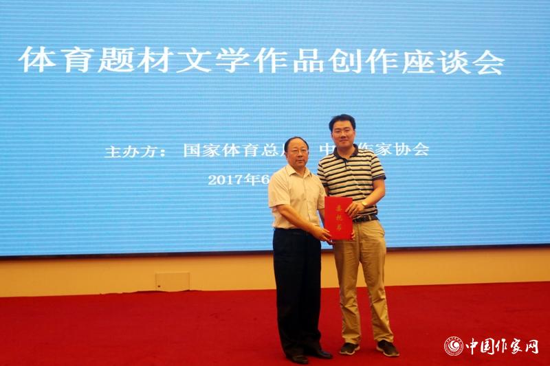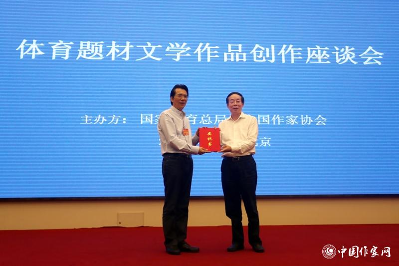 國家體育總局群眾體育司司長劉國永向作家關(guān)仁山(顧超代表)遞交創(chuàng)作委托書 中國作家網(wǎng) 超俠 攝