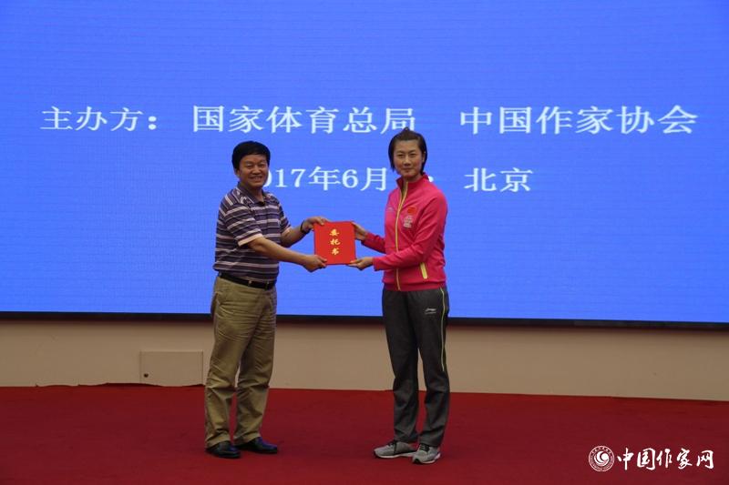 國家體育總局副局長、黨組成員趙勇向作家何建明遞交創(chuàng)作委托書 中國作家網(wǎng) 超俠 攝