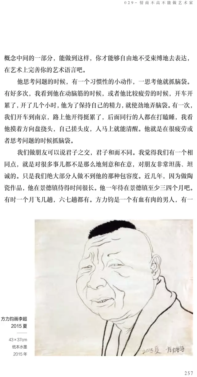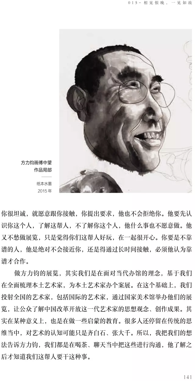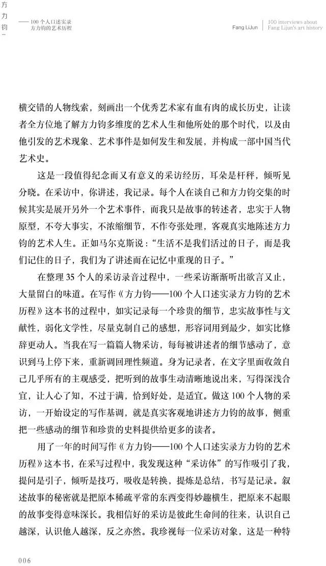 用了一年的時(shí)間寫作《方力鈞——100個(gè)人口述實(shí)錄方力鈞的藝術(shù)歷程》這本書,在采寫過程中,我發(fā)現(xiàn)這種“采訪體”的寫作吸引了我,提問是引子,傾聽是技巧,吸收是轉(zhuǎn)換,提煉是總結(jié),書寫是記錄。敘述故事的秘密就是把原本稀疏平常的東西變得妙趣橫生,把原來不起眼的故事變得意味深長(zhǎng)。我相信好的采訪是彼此生命間的往來,認(rèn)識(shí)自己越深,認(rèn)識(shí)他人越深,反之亦然。我珍視每一位采訪對(duì)象,這是一種特殊的緣分。