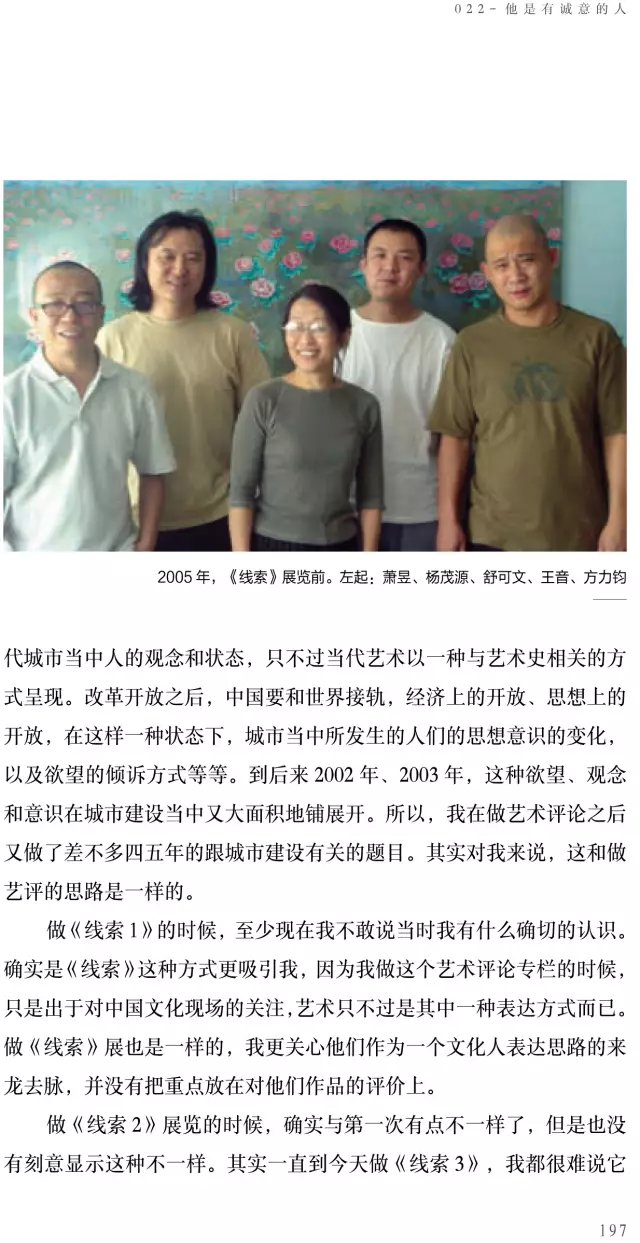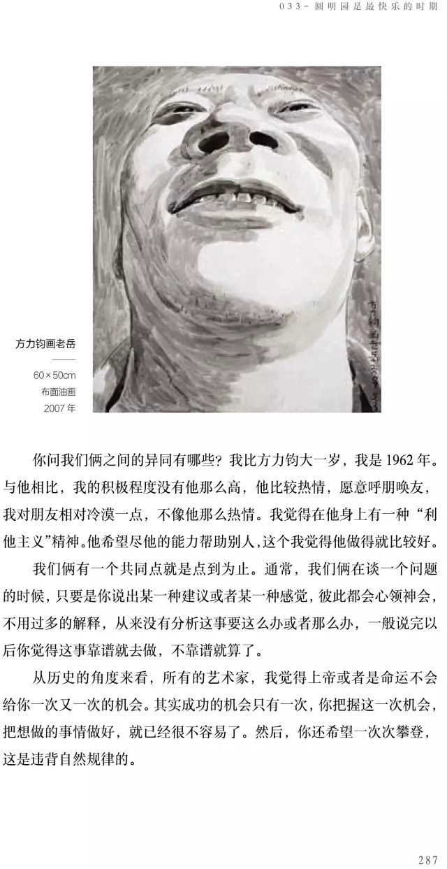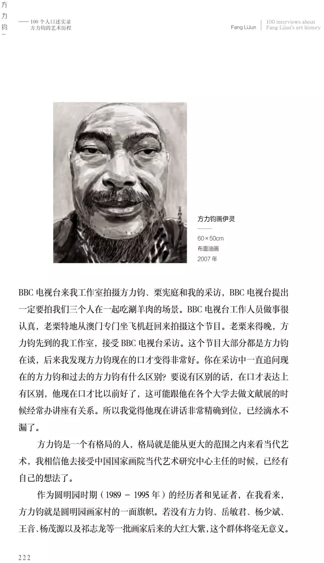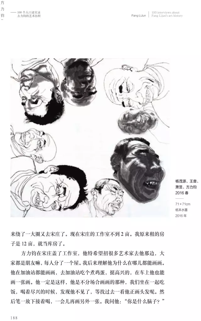 這本《方力鈞——100個(gè)人口述實(shí)錄方力鈞的藝術(shù)歷程》的書采訪了上百位嘉賓,我希望通過這100個(gè)人物口述實(shí)錄的講述,用100條縱橫交錯(cuò)的人物線索,刻畫出一個(gè)優(yōu)秀藝術(shù)家有血有肉的成長(zhǎng)歷史,讓讀者全方位地了解方力鈞多維度的藝術(shù)人生和他所處的那個(gè)時(shí)代,以及由他引發(fā)的藝術(shù)現(xiàn)象、藝術(shù)事件是如何發(fā)生和發(fā)展,并構(gòu)成一部中國(guó)當(dāng)代藝術(shù)史。