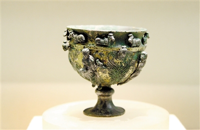 ▲人物動(dòng)物紋鎏金銀高足銅杯(公元5-6世紀(jì))。