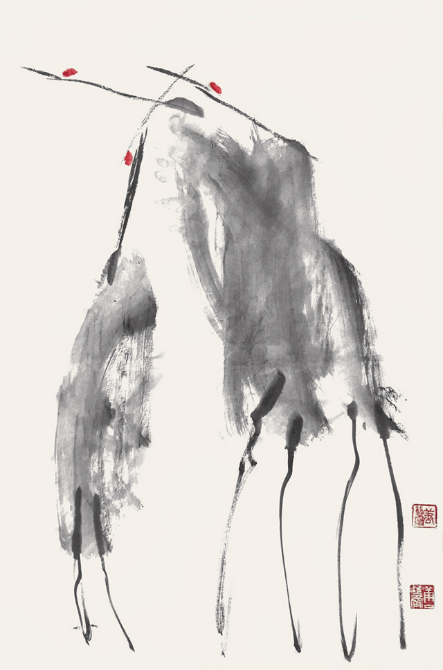 唐雙寧以狂草創(chuàng)作在當(dāng)代書壇獨(dú)樹一幟,狂草,是他獨(dú)具的造型語言,他自創(chuàng)的“飛狂草書”,將飛白引入狂草,中、側(cè)、散鋒并用,橫無行、縱無列,被譽(yù)為“有里程碑意義”(楊仁凱)?!皶廉嫗楦叨龋嬛?xí)鵀闃O則”(李苦禪),狂草的深厚造詣,使唐雙寧繪畫創(chuàng)作站在很高的起點(diǎn)之上 ,較快地找到了自己的藝術(shù)定位與創(chuàng)作范式,又借鑒畫家老甲的藝術(shù)風(fēng)格,形成獨(dú)具特色的造型語言。他的創(chuàng)作,把狂草精神引入繪畫實(shí)踐,運(yùn)用中國氣韻、骨法的點(diǎn)、線、飛白、渲染去布局造型,以狂草的氣勢、力量、變形、狂放寫意抒情,體現(xiàn)了藝術(shù)的變革精神、開拓意義與創(chuàng)新特色。
