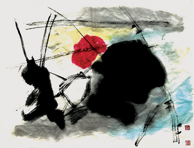 而在近年來狂草畫的創(chuàng)作中,唐雙寧終于完全掙脫文字中介,以狂草筆墨進(jìn)行現(xiàn)代繪畫創(chuàng)作,跨入全新的藝術(shù)空間。在由書入畫的驚險(xiǎn)一躍中,唐雙寧艱難蝶變,穿越書畫兩藝,縱身大化境界,漸入創(chuàng)作佳境。