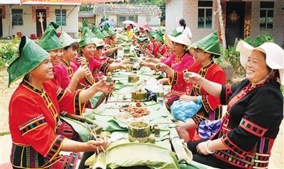 近年來,在保亭黎族苗族自治縣毛感鄉(xiāng),借助每年的節(jié)慶活動日,各村男女老少,穿著民族服裝,在一片開闊的稻田地里鋪開長桌宴,招待八方來客。
