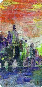《生的回聲》作于1982年,李青萍恢復(fù)公職之后,在她眼前是一片明朗的陽光?!俺赛S色的圈形象征太陽、地球與宇宙萬物生靈的運(yùn)轉(zhuǎn),椰樹象征我對南洋生活的深情眷戀和我的曲折而充滿活力的一生,人的生命如時鐘發(fā)條總會終止,吾輩已老,更應(yīng)珍惜時光。你們看那畫面上空的晚霞,正是我生命的回音,藝術(shù)的曙光?!彼诨貞涗浿羞@樣寫道。