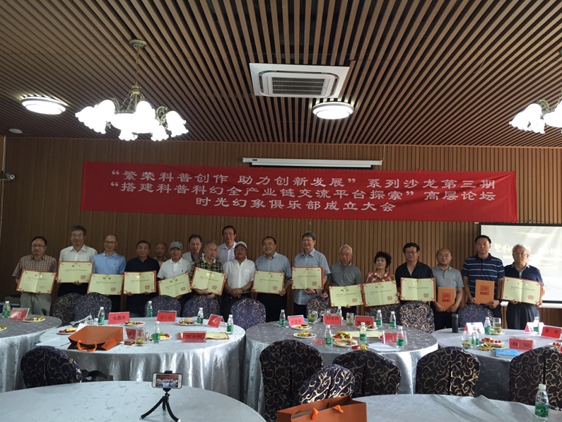 2017年6月25日,由中國科普作家協(xié)會主辦、成都時光幻象文化傳播有限責任公司承辦的“搭建科普科幻全產業(yè)鏈交流平臺探索”高層論壇——“繁榮科普創(chuàng)作 助力創(chuàng)新發(fā)展”系列沙龍第三期暨成都時光幻象俱樂部成立大會在成都溫江時光幻象公司娛樂部——楚天印象酒樓舉行。