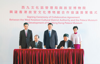 在香港特別行政區(qū)行政長(zhǎng)官梁振英、候任行政長(zhǎng)官林鄭月娥陪同下,習(xí)近平見證了香港特區(qū)政府政務(wù)司司長(zhǎng)兼西九文化區(qū)管理局董事局主席張建宗與故宮博物院院長(zhǎng)單霽翔簽署《興建香港故宮文化博物館合作協(xié)議》。