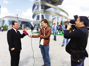 艾克拜爾(左一)在2017年阿斯塔納世博會上接受哈薩克斯坦電視臺記者采訪。 艾克拜爾