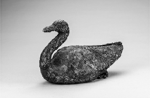 此秦代銅雁出土于距秦始皇陵園最遠(yuǎn)的一座陪葬坑,坑內(nèi)有象征性河道,46件銅禽排列在河道兩側(cè),其中銅鶴6件,銅天鵝20件,其他為鴻雁等禽類。