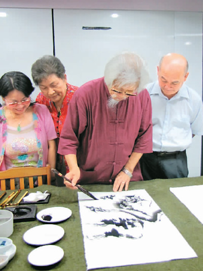 第一次與王太田先生見面,是在夏日的一個午后,在臺北“國父紀念館”西文化藝廊。那天,太田先生所帶學(xué)生的結(jié)業(yè)畫展在這里揭幕,這也是34年來,太田先生在此業(yè)余教授的第三十四期生活美學(xué)國畫山水班學(xué)生的作品展覽。記者發(fā)現(xiàn),這30位“老學(xué)生”,雖然最小的已年逾花甲,最大的101歲,但是,簇擁在須發(fā)皆白的太田先生身邊,完全是一副“小學(xué)生”的虔敬模樣。他們一邊仔細觀摩老師示范作畫,一邊認真聆聽老師教誨:畫山水畫時,自己心中首先要有一幅山水畫,畫作要先感動自己才能感動別人。