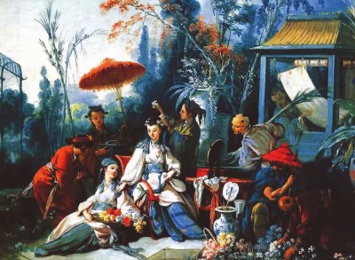 在17、18世紀(jì)的歐洲,當(dāng)?shù)厮囆g(shù)家創(chuàng)作的中國風(fēng)裝飾畫曾一度盛行。這樣的異域想象,很可能受中國瓷器鮮明的色彩、畫屏上身著華麗刺繡長袍的東方人面孔等影響。其中,華托、布歇、皮耶芒都是這股風(fēng)潮中閃亮的名字。法國畫家弗朗索瓦·布歇以 《中國婚禮》 《中國捕獵》 《中國漁情》《中國舞蹈》 《中國市場》 《中國風(fēng)俗》《中國花園》 等為題,創(chuàng)作了一系列中國風(fēng)掛毯,描繪的大多是迷人的東方田園生活。畫面中出現(xiàn)了大量的中國元素,如亭臺(tái)樓閣、陶瓷、油紙傘、斗笠,盡管更像戲裝的人物服裝略顯夸張,卻流露出濃郁的東方神秘色彩。