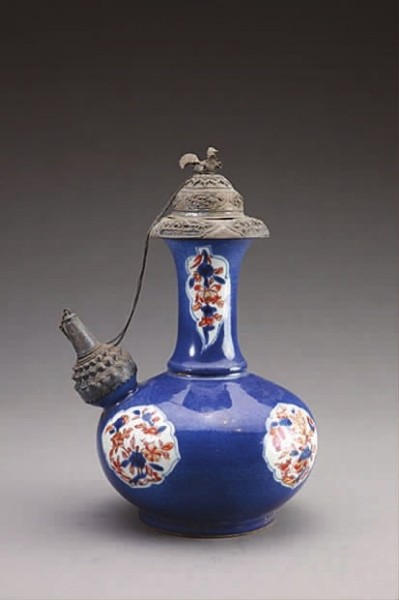 故宮藏藍(lán)地開光折枝花紋軍持。“軍持”本為印度佛教徒飲水、凈手或飯后漱口使用的器皿,漢代以來隨佛教傳入中國。日后它逐漸變成一般的生活器具,多銷往東南亞地區(qū)。為了防止器物口、流的殘缺和使用的方便,這類瓷器往往進(jìn)行了一些裝飾性加工,在其口、流或執(zhí)柄等處鑲嵌上鏨刻花紋的金、銀、銅制裝飾,有的則在壺的口部加裝金屬蓋子,并在蓋與執(zhí)柄之間連接金屬鏈條,防止壺蓋掉落,實(shí)用與美觀相結(jié)合,具有異域風(fēng)情。