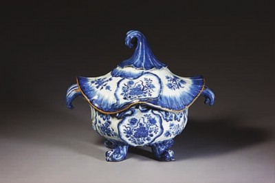 故宮藏清雍正青花葉紋開光花卉紋雙耳帶蓋湯盆。這是為適應(yīng)歐洲人飲食習(xí)慣而特制的器皿,系歐洲國家定燒之物。