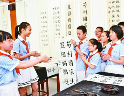 福州市瑯岐實(shí)驗(yàn)小學(xué),同學(xué)們?cè)谡故咀约簳鴮懙拿思绎L(fēng)家訓(xùn)。新華社發(fā)