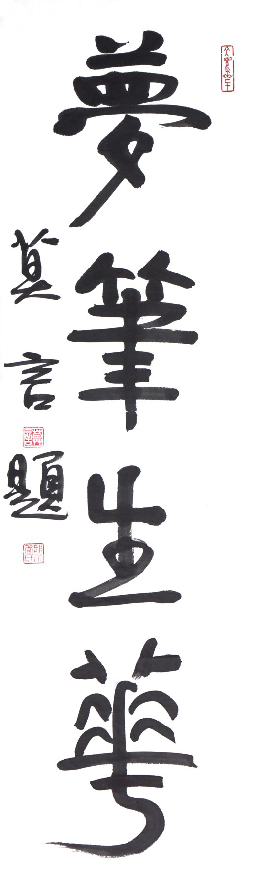 此次展覽中莫言、李敬澤、歐陽(yáng)江河、張大春、馮唐、楊葵、鄭培凱、崔曼莉、徐則臣幾位作家均有書(shū)法作品展出,風(fēng)格各異。張大春學(xué)書(shū)以歐陽(yáng)詢開(kāi)竅,其《行書(shū)自作登樓歌卷》瀟灑自得,結(jié)字疏密勻停,爭(zhēng)讓得體,從其作品可見(jiàn)涵養(yǎng)和學(xué)問(wèn)的深厚。鄭培凱喜讀帖,作品《我為你寫(xiě)詩(shī)》和《臨江仙》結(jié)字平正安穩(wěn),氣韻流暢,可見(jiàn)其對(duì)漢字結(jié)構(gòu)和線條變化的深刻研究,頗有王羲之行書(shū)風(fēng)范。莫言的《夢(mèng)筆生花》,藏鋒運(yùn)筆,結(jié)字端莊,渾樸沉著;歐陽(yáng)江河《以夢(mèng)為馬》的篆體纖細(xì)古拙,起筆宿墨與結(jié)尾飛白形成奇趣的藝術(shù)效果;李敬澤的隸書(shū)典雅樸厚,另有春秋。